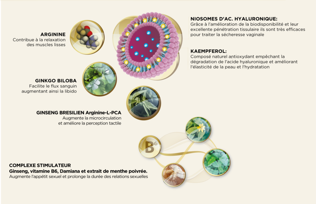 Moritoki, H., Takeuchi, S., Hisayama, T., & Kondoh, W. (1992). Nitric oxide synthase responsible for l‐arginine‐induced relaxation of rat aortic rings in vitro may be an inducible type. British journal of pharmacology, 107(2), 361-366 ; Moritoki, H., Ueda, H., Yamamoto, T., Hisayama, T., & Takeuchi, S. (1991). l‐Arginine induces relaxation of rat aorta possibly through non‐endothelial nitric oxide formation. British journal of pharmacology, 102(4), 841-846 ; Jovanović, A., Grbović, L., & Tulić, I. (1994). L-Arginine induces relaxation of human uterine artery with both intact and denuded endothelium. European journal of pharmacology, 256(1), 103-107 ; Cohen, A. J., & Bartlik, B. (1998). Ginkgo biloba for antidepressant-induced sexual dysfunction. Journal of sex & marital therapy, 24(2), 139-143 ; Waynberg, J., & Brewer, S. (2000). Effects of Herbal vX on libido and sexual activity in premenopausal and postmenopausal women. Advances in therapy, 17(5), 255-262 ; Cohen A, Bartlik B. Treatment of sexual dysfunction with Ginkgo biloba extract [scientific reports]. Presented at: 150th Annual Meeting of the American Psychiatric Association; May 18-21, 1997; San Diego, Calif. ; Brochure Nio-OligoHA, Naturalis Life Technologies (Italia) ; Brochure ‘Biological amplifier of the sensory pleasure ArgiSens®, Solabia Group (Francia Feb 20th, 2008) ; Brochure ‘Pruebas de Efectividad New Life Complex®’, BIOGRÜNDL (Barcelona).